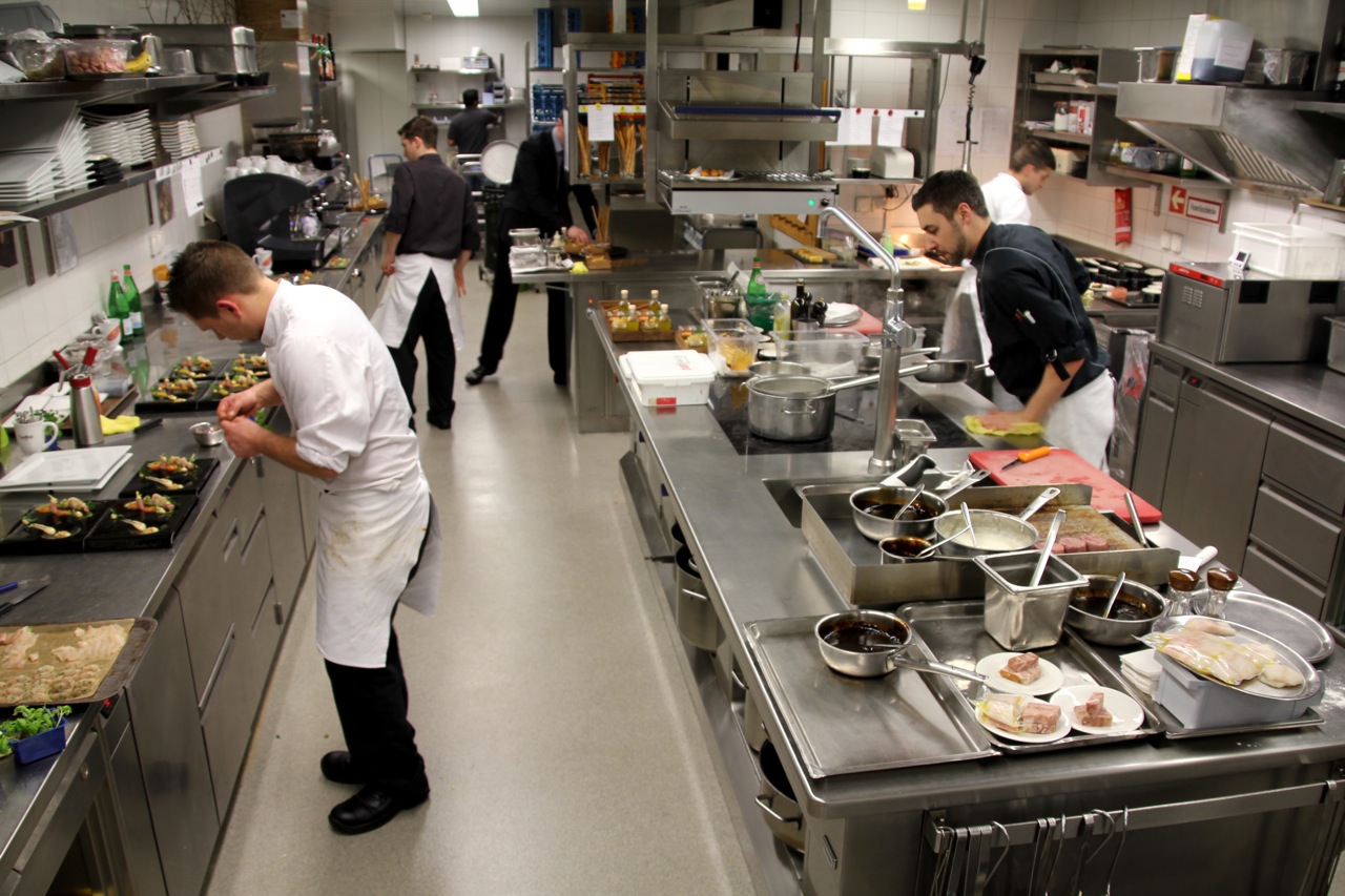 Hinter dem Herd fachsimpelt Fermi mit dem Garde Manger über den Zuschnitt der Entrecôtes – der Meister für Kaltspeisen hat an diesem Abend wegen einer Absenz die Rolle des Sous-Chef inne. Auch der Autor macht sich nützlich: Zuerst werden Taubenbrüstlein mit Orangenöl und Paradieskorn mariniert, danach müssen Spargeln geschält werden. Nicht, dass die Hilfe nötig wäre – die junge Küchencrew ist eingespielt wie der FCB während seiner englischen Wochen.
