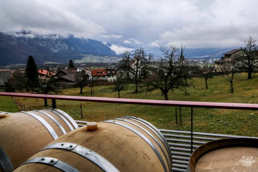 Nach Besuchen bei Martin Donatsch und Giani Boners Completer-Kellerei Mitten in Malans bewegen wir uns den Hang hinauf in Richtung Dorfrand zu Peter Wegelins Scadenagut. Dort hat nicht nur der Winzer einen wunderbaren Panoramablick…
